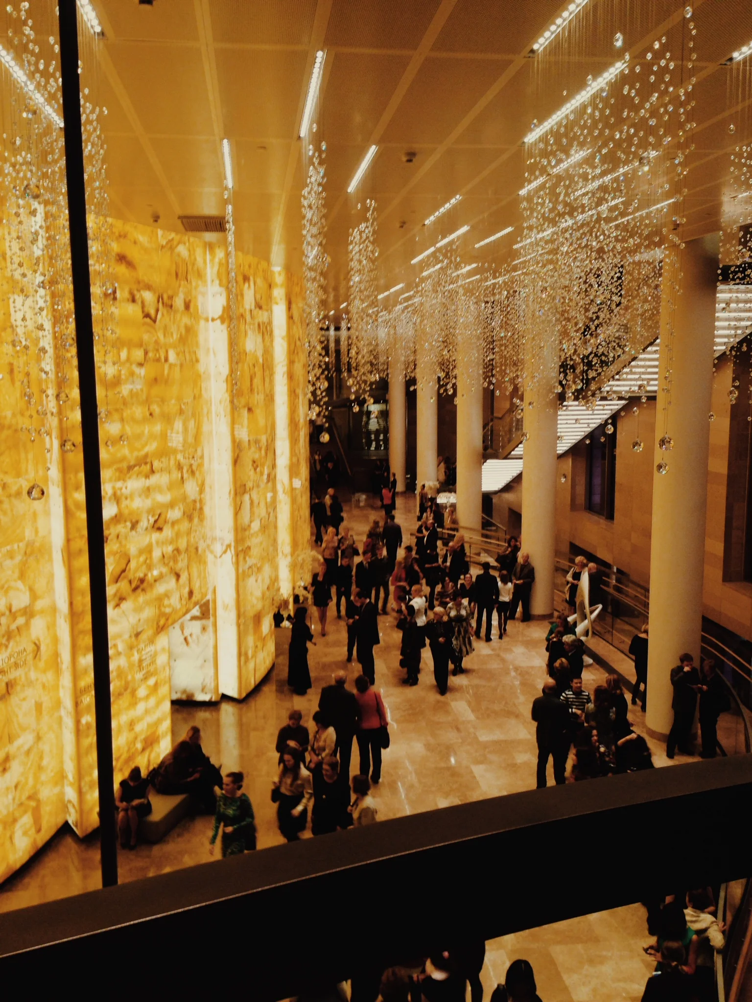 The entire interior of the building seems to have been inspired by the famous Amber Room in Catherine Palace in nearby town Tsarskoe Selo/Pushkin. Its warm, golden light can be felt all around as one strolls through the knots of people clustered about the halls during intermission. There are long ropes of crystal tears, or raindrops maybe, that refract the radiance cast by the walls and by the lights shining from above each section of crystals. They seem to harken to the rain which most likely awaits us outside when we will inevitably have to leave the golden theatre, the tears we may have shed during a particularly emotional aria, and also the joy that will (like bubbles) fizz out of us for days after our theatre outing.